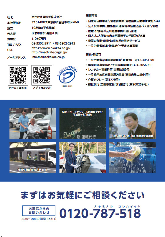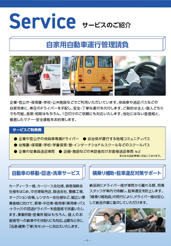 登録ドライバー・運転手300名(男女)中央省庁、各官庁、東京都、市区町村、入札資格承認済み、各種クレジットカード決済可 自家用自動車管理請負・運転代行 業務災害補償・任意労災・障害総合各種保険加入済み